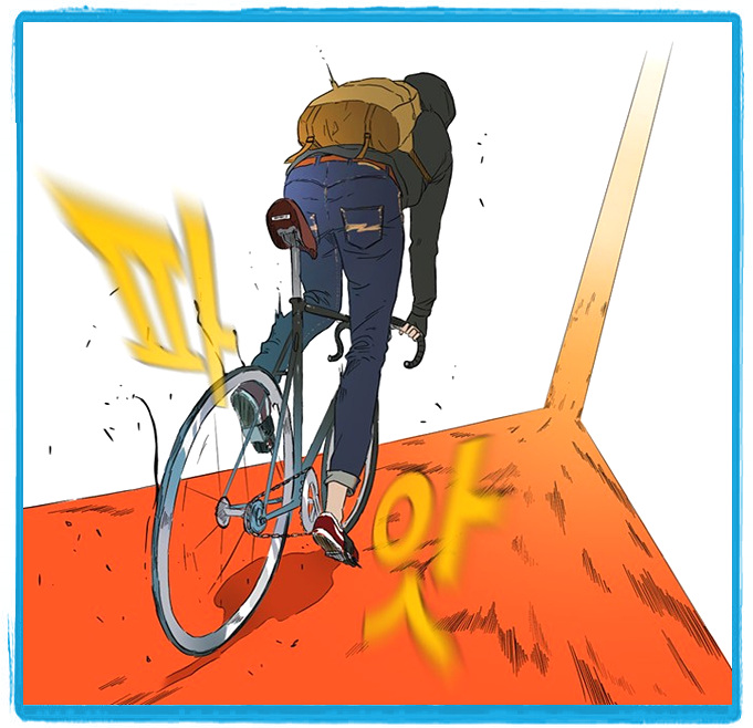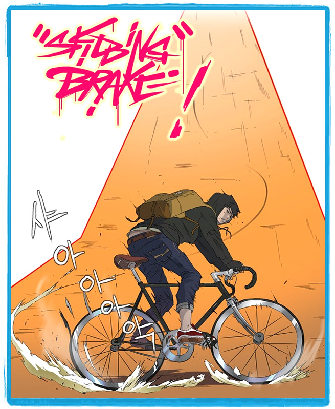 자전거라는 특이한 소재를 다루는 웹툰입니다. 배틀시에 연출력이 상당히 뛰어납니다. 개인적으론 초반 몰입도가 그리 높지 않으나 중후반부 라이딩 배틀에서의 깊은 몰입감이 인상적입니다. 본격 자전거 사고 싶게 만드는 만화라 할 수 있겠습니다.